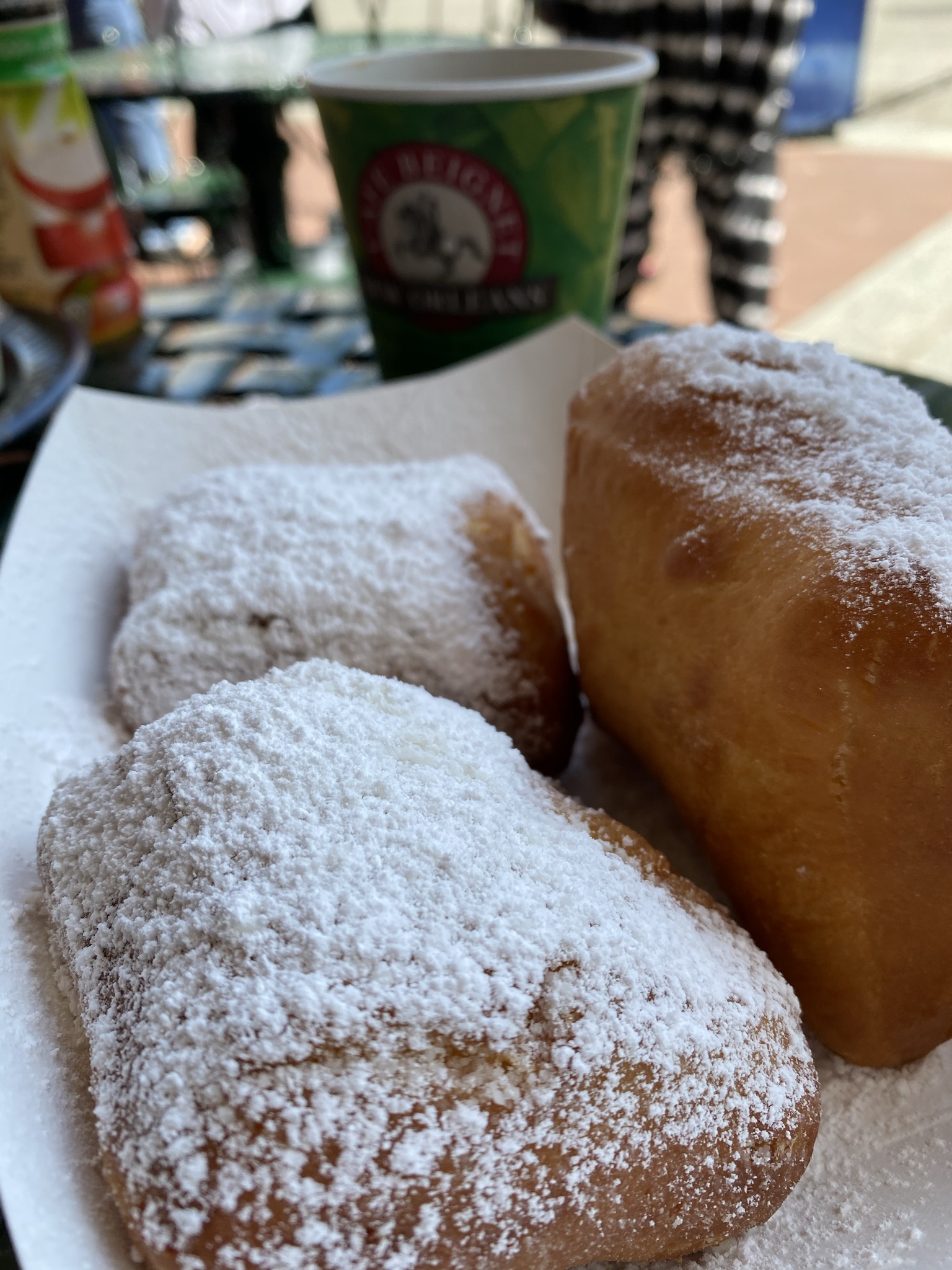Since we had plans to see the plantations the same day, we were not about to spend two hours standing in line for pastries. Instead, we did our tour and stopped at the Cafe Du Monde on Williams Blvd in Kenner, LA- just 15 min drive from the center of town. We got our sweet tooth fix with absolutely no wait. Beignets were light and fluffy and perfect. We did return to the original location during the work week and the line was very short late afternoon. However, the pastries were not as fresh/did not taste as good as the other location.