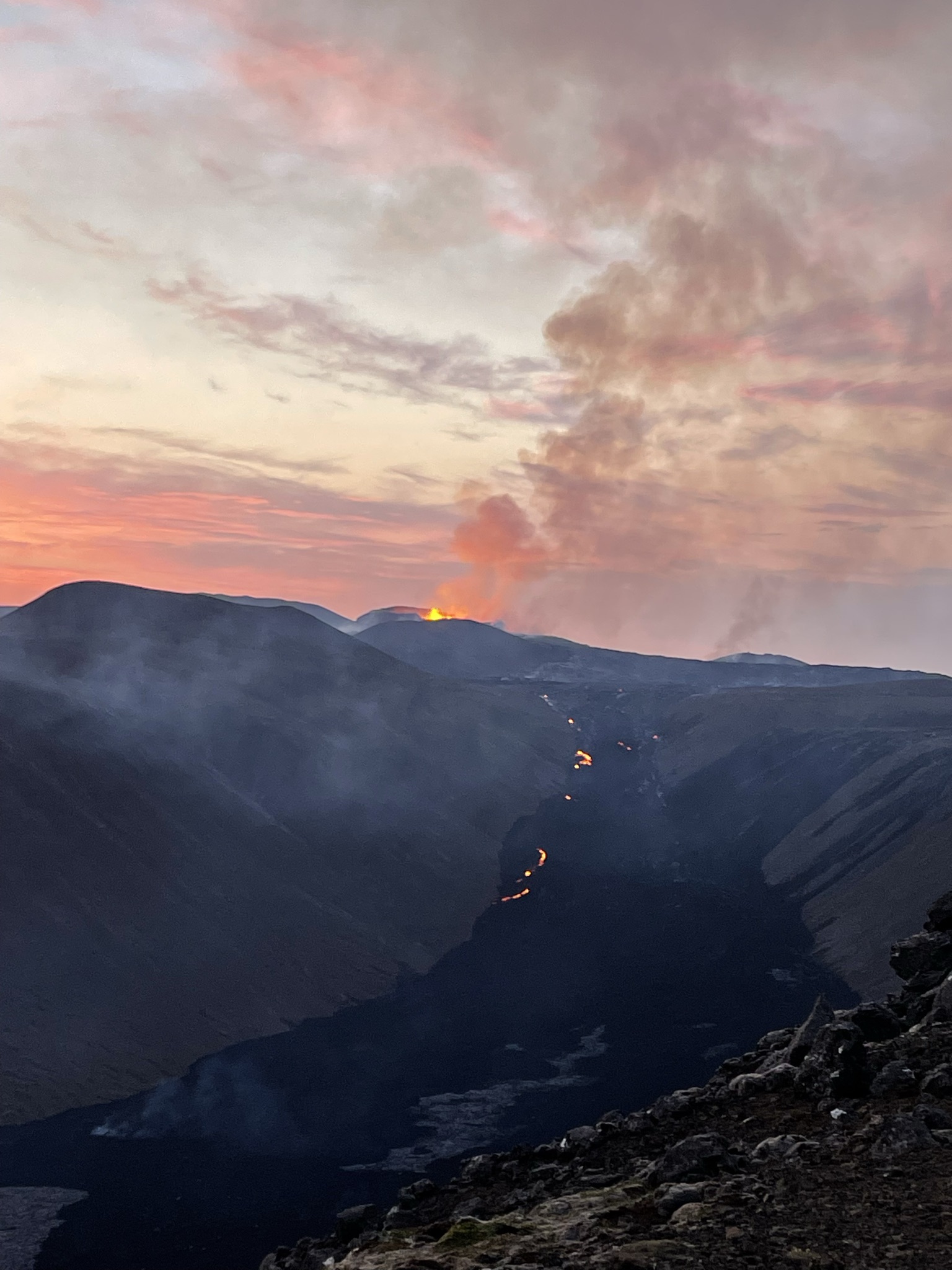 The most amazing thing (besides the active volcano of course) was the daylight- it never got dark. Sunset around midnight and sunrise around 3am never brought darkness. The advice that we got to go at this time of the night was right- the red lava was bright and clearly visible during dusk. I don’t think we would’ve seen such amazing views if we went during the day. We met another friendly couple along the way and they shared their drone videos with us- SUPER amazing. The drone got very close, but then ran out of batteries and never made it back. Ooops, well at least there is an awesome footage and we are very grateful for it.