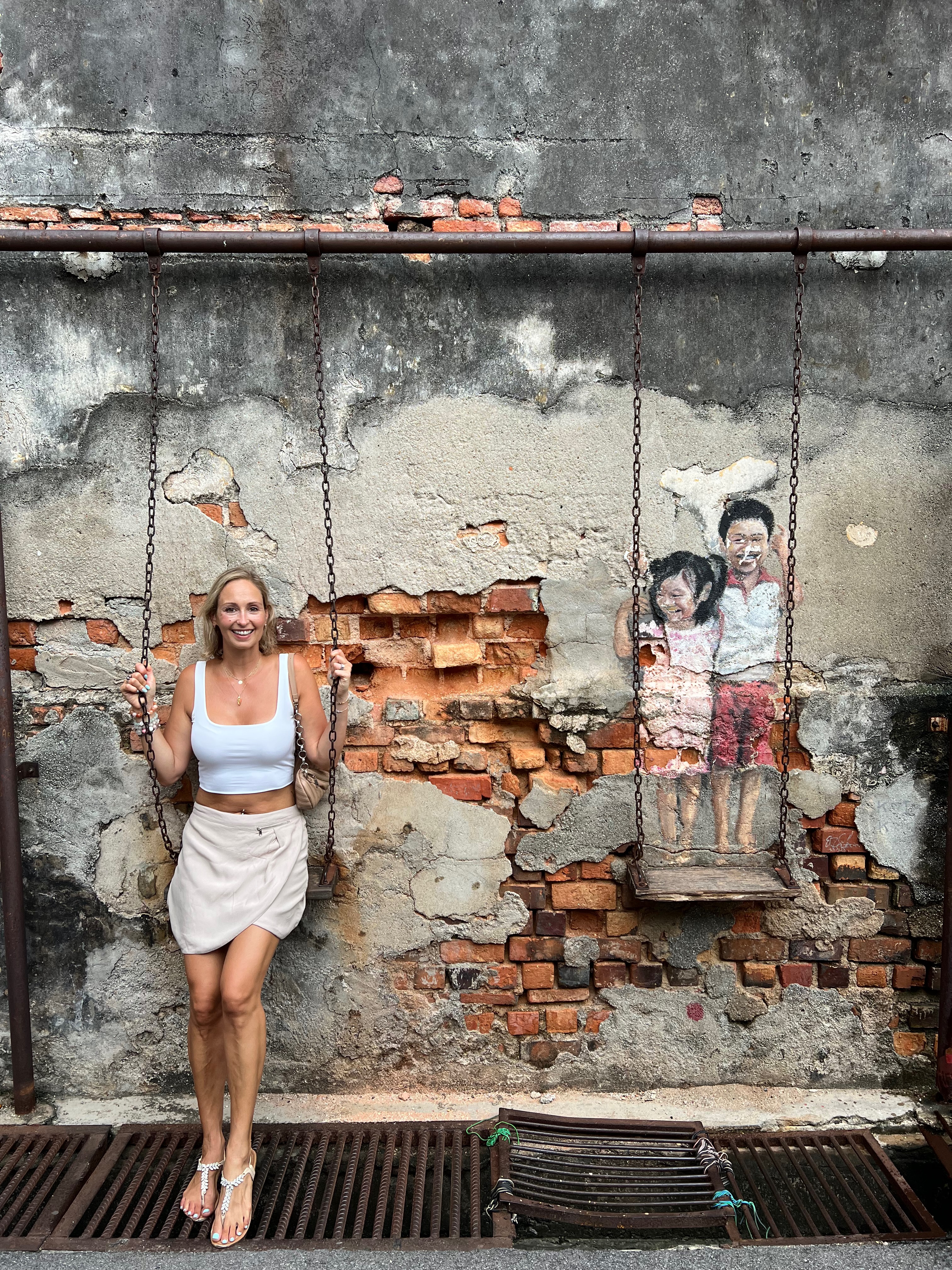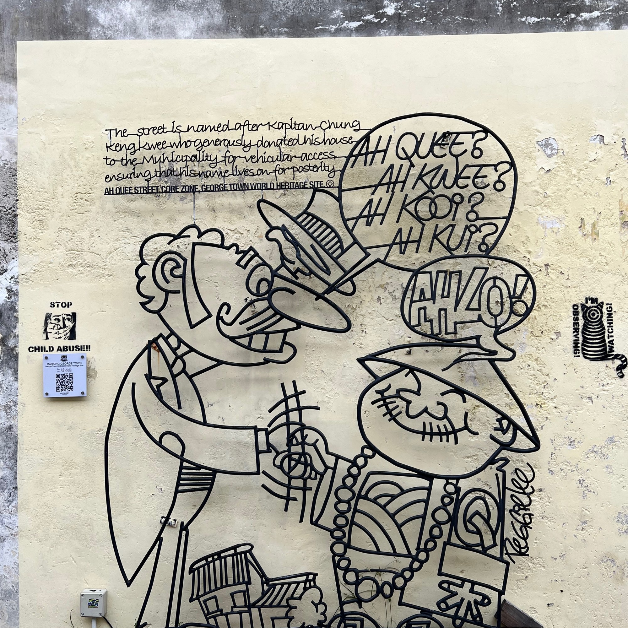 The very cool part of these pieces is that the kids were actually from Penang and now they are all grown up (initial murals were done in 2012). Also, the art on the wall is accompanied by an actual object- bicycle, swing, bike – making these pieces not just a painting on a wall, but more interactive art.