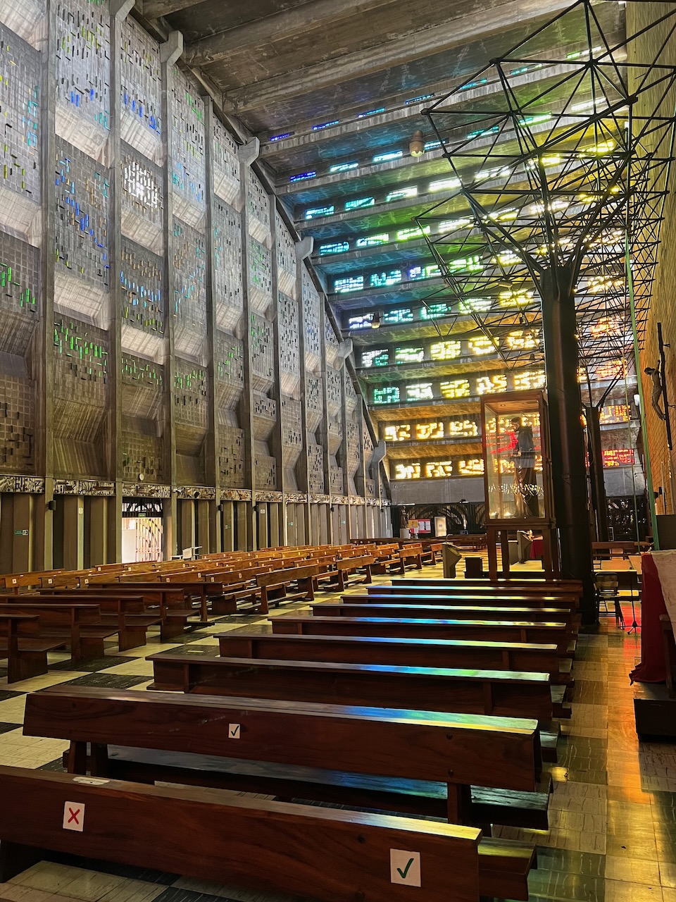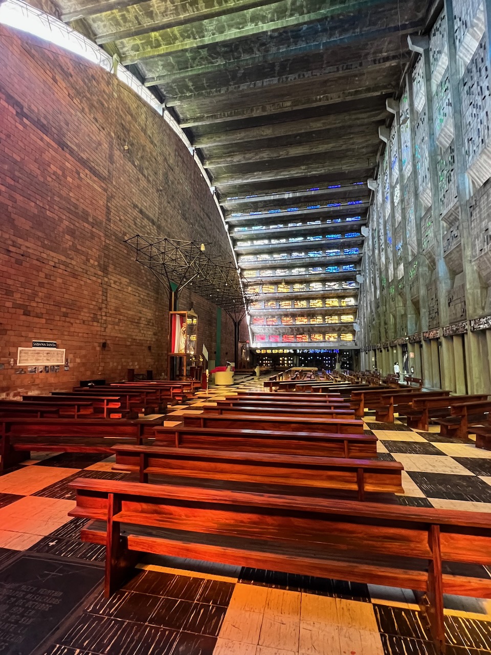Besides a very interesting design, this church simply wowed us with the light coming through the colorful glass windows. The best part- nobody was there, so we got to admire the rainbow on the floor and really take it in. Obviously you want to go here during the daylight if you want to see this play of light.