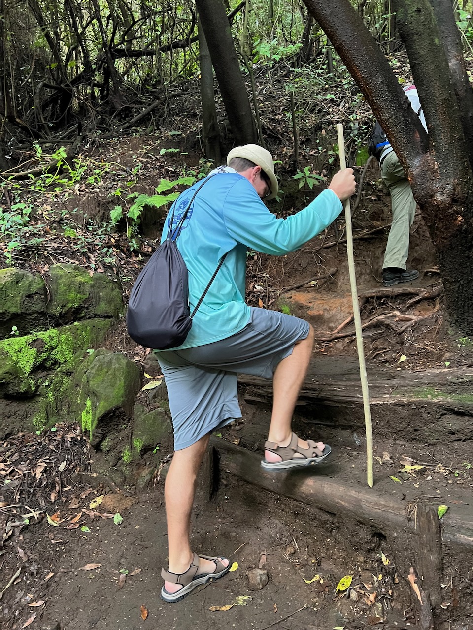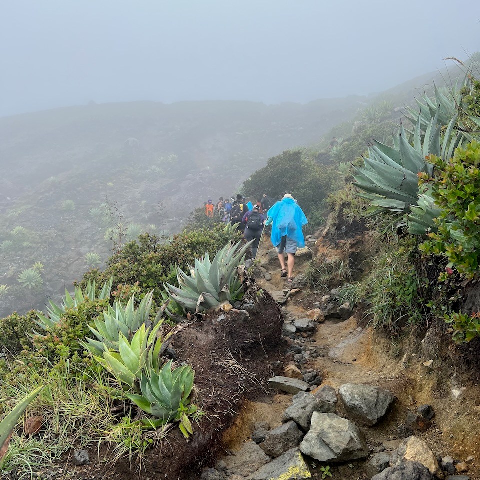 Indeed the hike can only be done with the guide and it started at 9.15am. Because the group was so large we had several guides. To be honest I am not sure what happens if you show up too late. Someone said that there are local guides waiting around and you might pay them directly, but I don’t know if that’s how it works. We all had to pay I think $6 pp in the parking lot (I am not 100% sure of the amount, but it was not much and it was cash). The group got the same color bracelets and moved aside. The guide went over the hike, explained the rules etc. After a short walk we had to pay another small fee and then the real hike started. And so did the rain. And the fog.