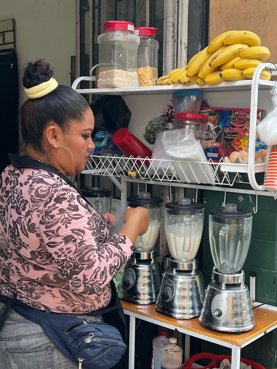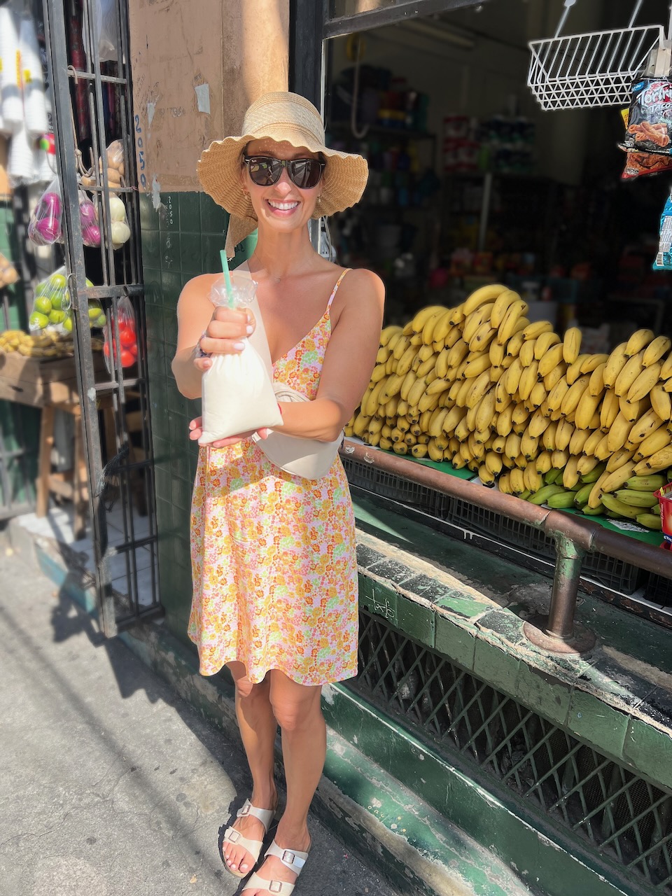 Historical Center was pretty busy, people were playing music and dancing in the plaza. It’s a quick stop though, I don’t think you need to spend much time there. On the way back to the car we saw a line of people waiting for the a drink that was served in a plastic bag. I got curious and decided to try it. It’s a licuado- basically a milkshake. Mine was with banana, ice, milk and lots of sugar 🙂 .