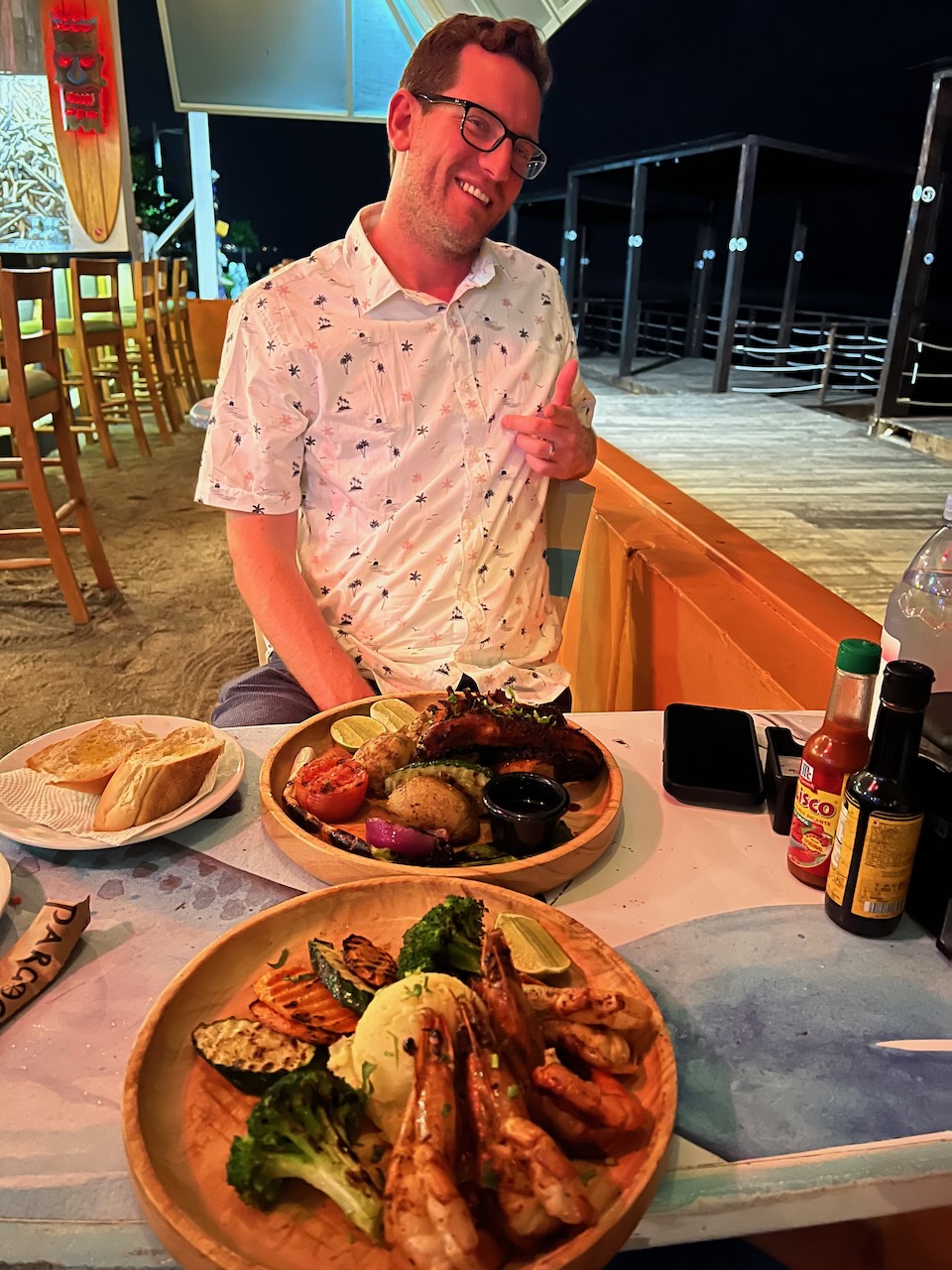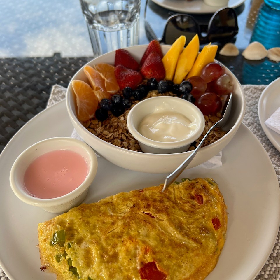 We had two dinners at the hotel- one was in the room, because of the heavy rain and the wind that started right around dinner time. The other one was at the table in front of the ocean. We also had breakfast and everything was really tasty.