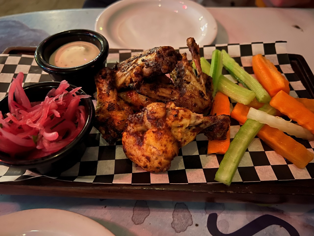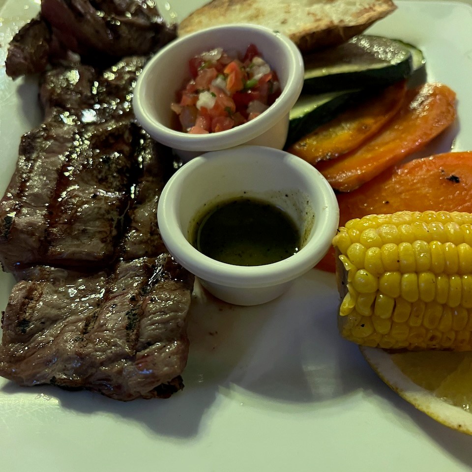 For dinner we went to Las Brumas Grill & Cafe– a very short drive from the slide. We hoped to make it there for sunset because the view is incredible, but by the time we were done with the slide it was dark. It still was a nice view with the lights in the distance and the dinner was excellent.