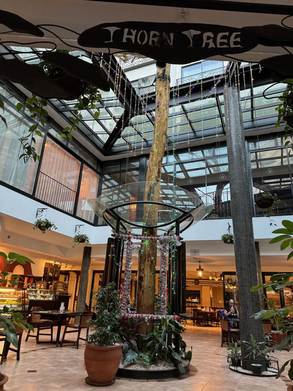 The legendary Thorn Tree Café is an open air cafe in the hotel. According to the Wikipedia: Travellers used to pin notes to others onto the thorns of the tree. The current tree is the third of the same variety. The first was planted in 1961, and when it was ailing a new one was planted in its place. This new tree began to droop, and in 1997 was replaced with the current tree. During the planting ceremony, a time capsule was buried beneath it, to be opened in 2038!
