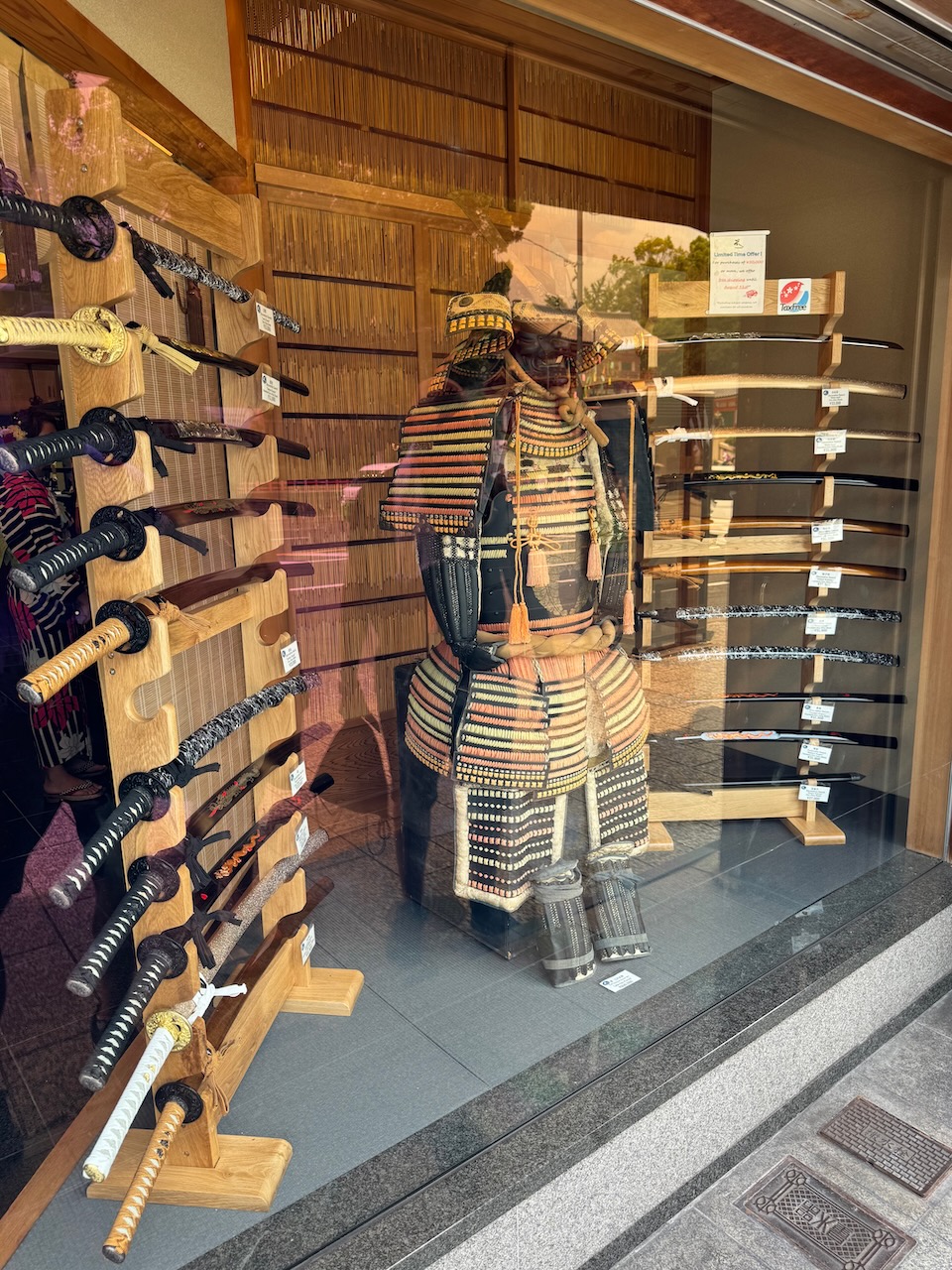 As expected it was a hot day, so to find some reprieve we wandered into some shops along the way. One of them was Tozando Gion-Yasaka – knife/sword store selling real samurai swords, some as expensive as 25 000 USD.