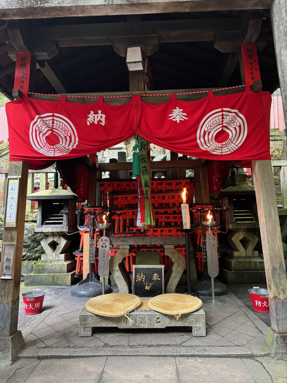 There are many fox (kitsune) sculptures along the way. Fushimi-Inari-Taisha is for the god Inari, which is the god of the rice harvest, commerce and business. The messenger of the god Inari is the fox. They sometimes have a key in their mouth, which represents the key to the rice storehouse in ancient times.