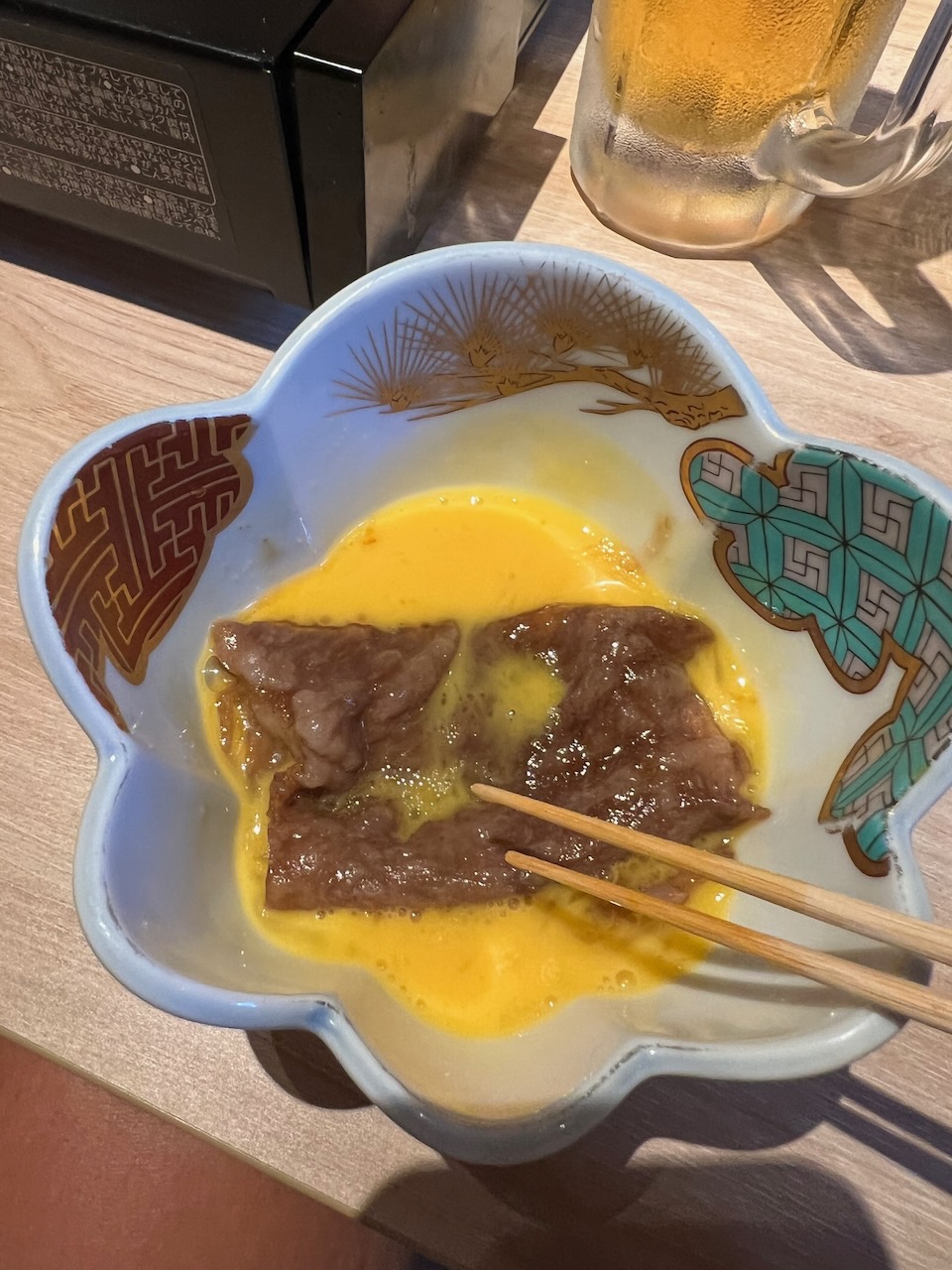 Where as the night before we cooked the meat on the little grill ourselves, here we had a person doing that for us. It was interesting that the sauce had sugar in it and that we dipped the cooked meat into the raw egg yolk.