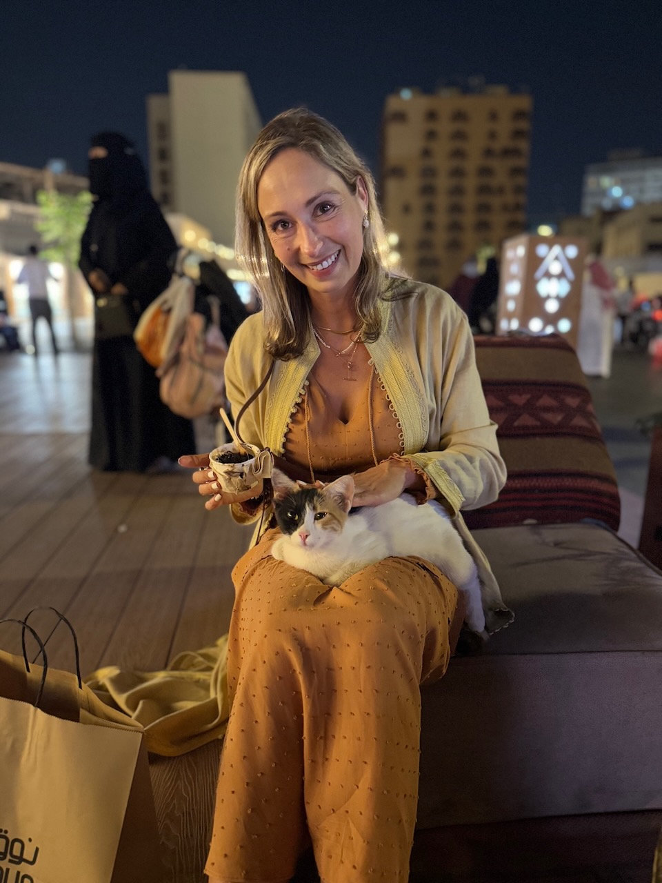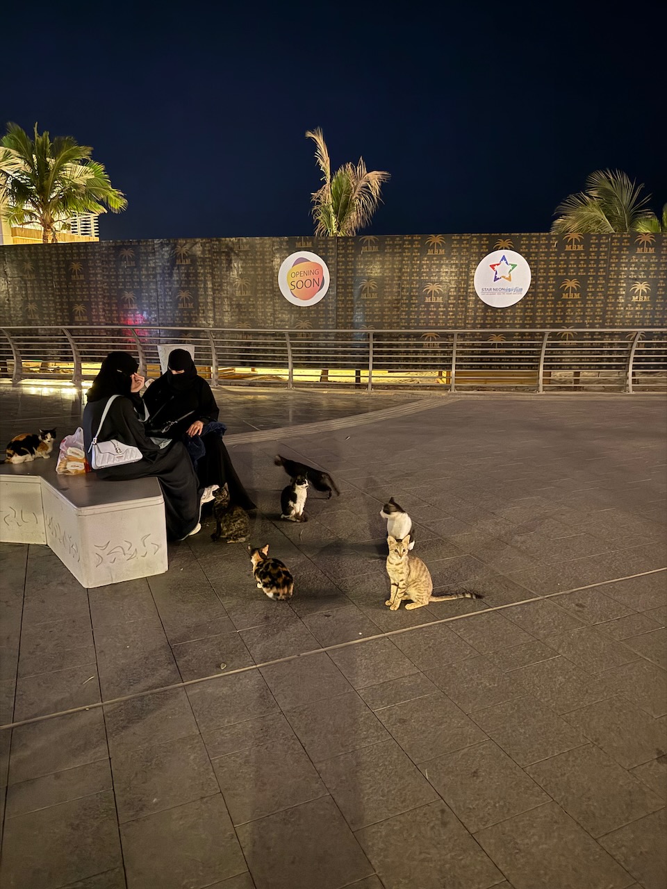 Super cute kitty was sitting on a chair, so I sat near him. He ended up on my lap and then a local Saudi man came to us with his son. After asking where we are from, he officially announced: “I’d like to inform you that these cats are wild and dirty!” We thanked him for this ‘info’, but the kitty remained on my lap for a bit longer. I’d like to inform that he was for sure not dirty and very sweet.