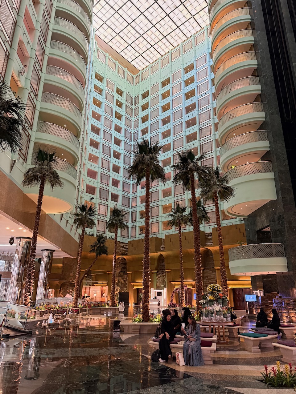 The inner yard connecting the two places has a mosque and Hilton has an outdoor pool. Now comes the rules part. Only men and children can swim in the outdoor pool. Women have a gorgeous spa in the Waldorf Astoria, but it’s inside and only women are allowed to enter. So as much as Saudi Arabia is progressing, some of the strict rules are still in place. It was over 80F outside and we really would’ve liked to jump in the pool together, but that was not allowed (so neither of us went in).