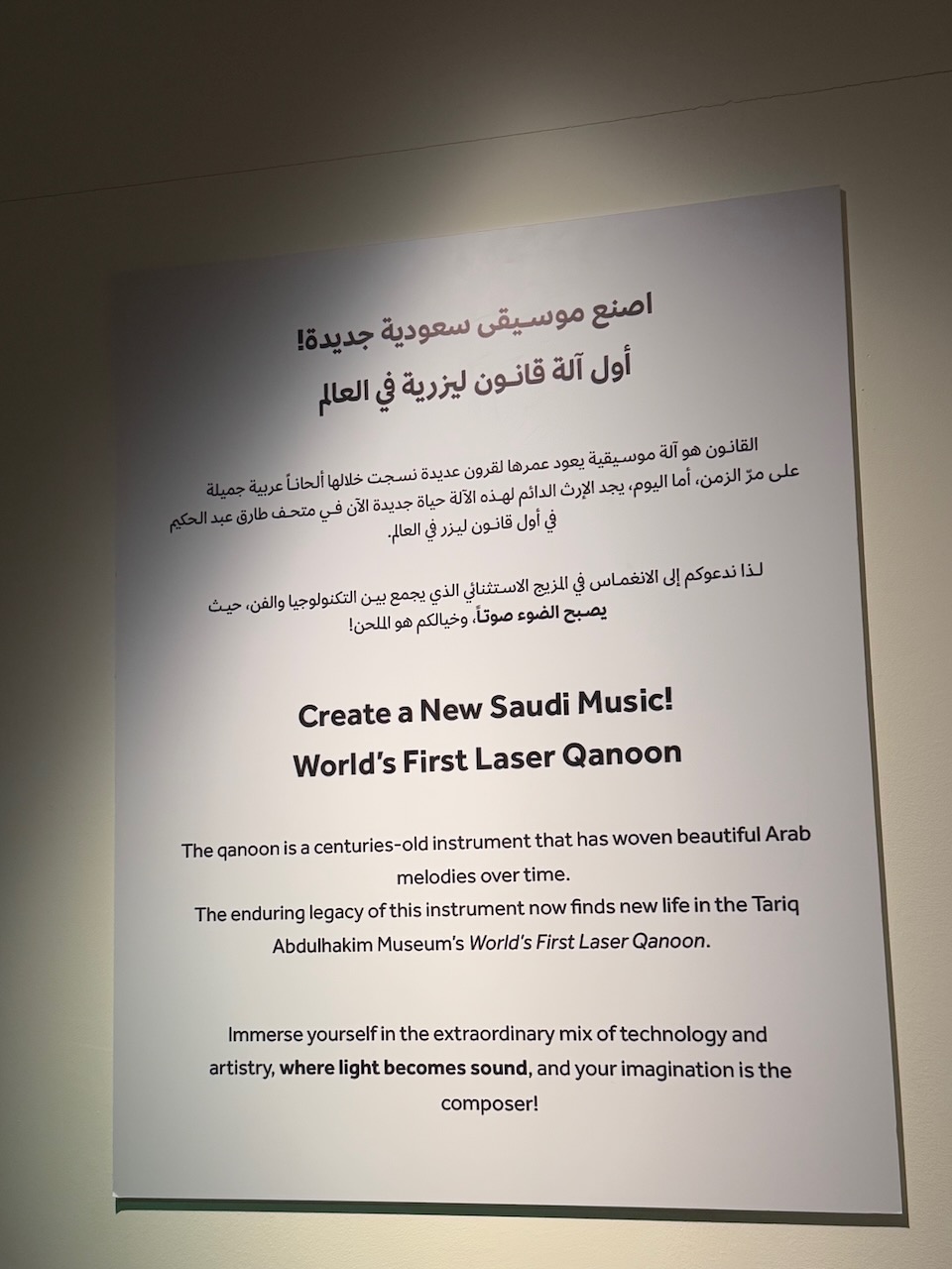 Tariq Abdel-Hakim was a well known Saudi Arabian musician that was dedicated to preserving cultural heritage. This museum has exhibitions of his instruments, you can listen to some of this performances and there is an interactive instruments room. We did not show many talents there unfortunately. It was very cool to play with the world’s first laser quanoon though!