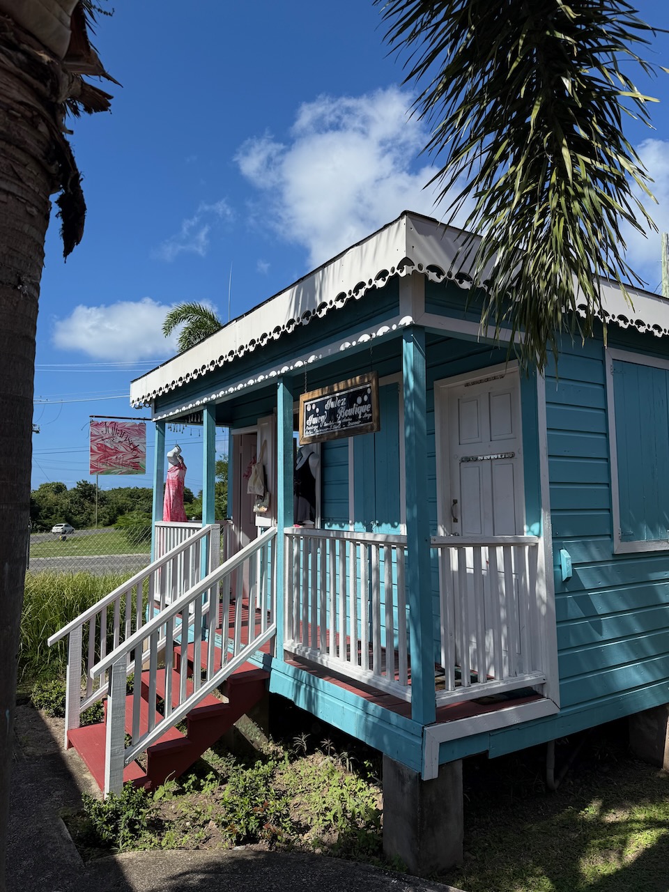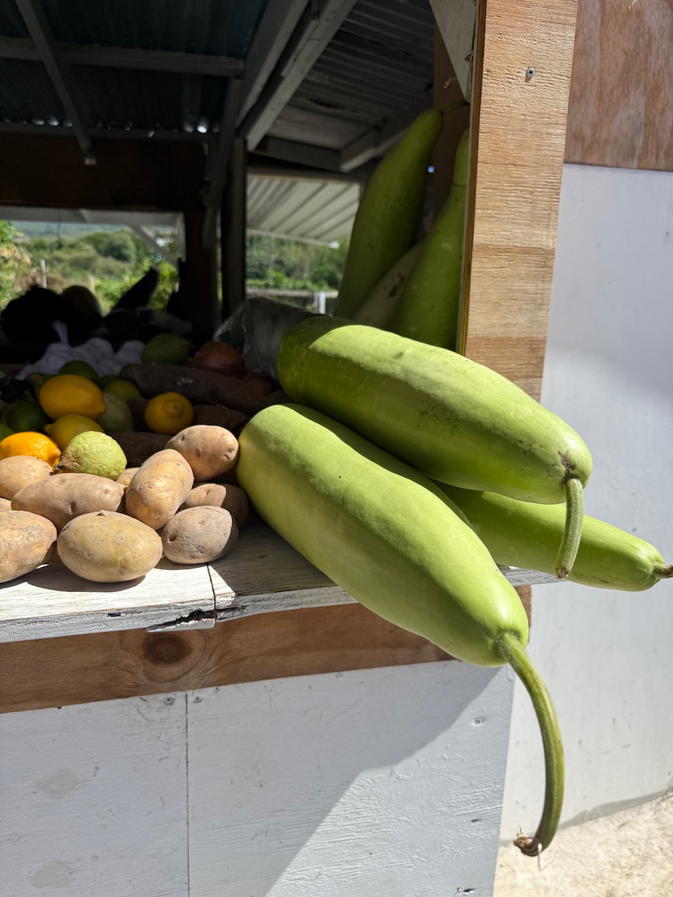 On the way to our next point of interest we stopped at the fruit and veggies stand. Not all produce is local, some imported from the nearby islands, so I was very clear- please only give me the local fruits. It was more than enough. I got a huge watermelon, a few mangos, melon, cantaloupe and she threw in a starfruit for good measure. We cut it up back in the hotel and had enough fruit for three days!