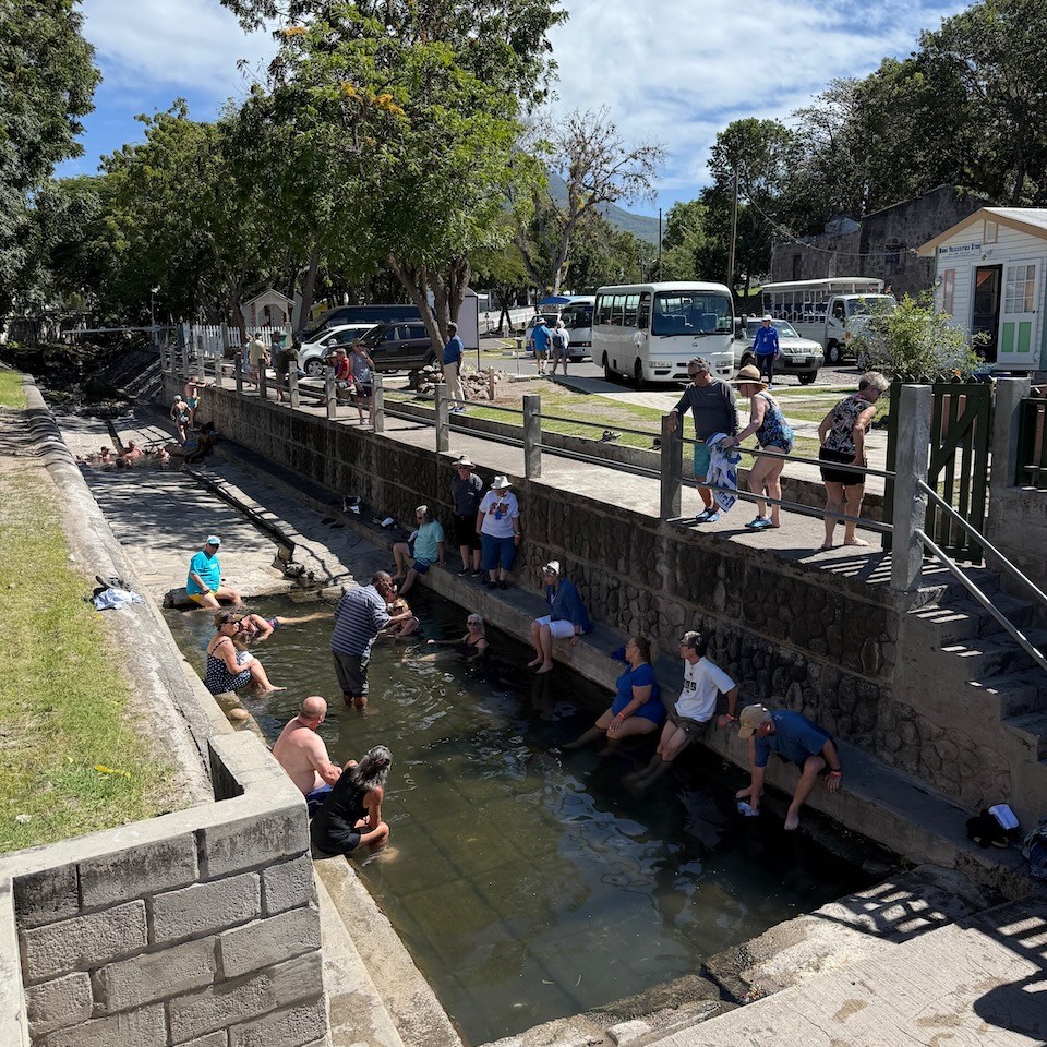 Right near the Bath Hotel there are Nevis Hot Springs that claim to cure all the ailments! Who does not want to heal all aches and pains?! The pools are different shapes, sizes and temperature. There is a small fee to use the baths, there are bathrooms and changing rooms.The lady also rents little towels for those that don’t want to fully submerge into the water. We brought bathing suits and went all in, some people only dipped their feet.