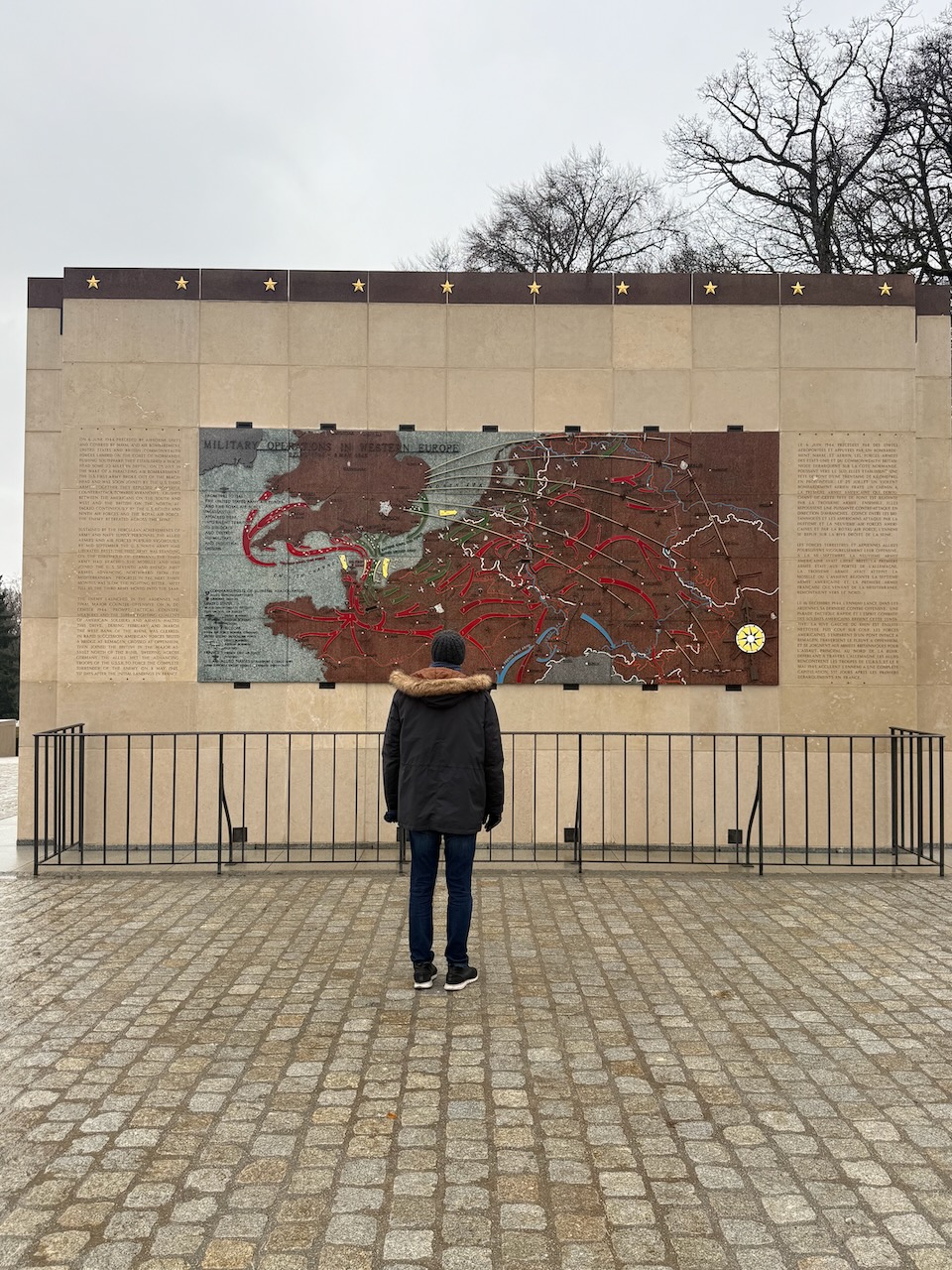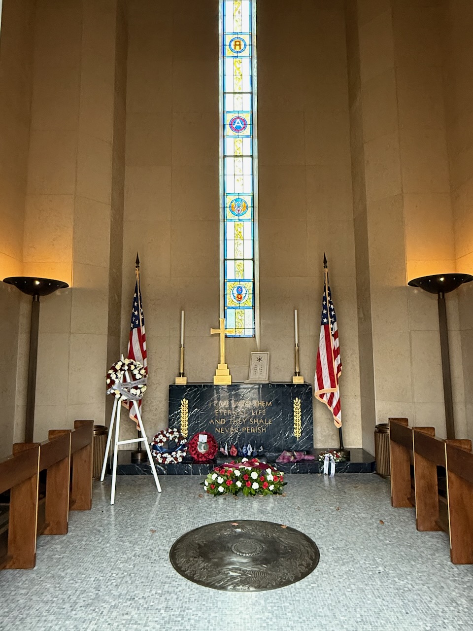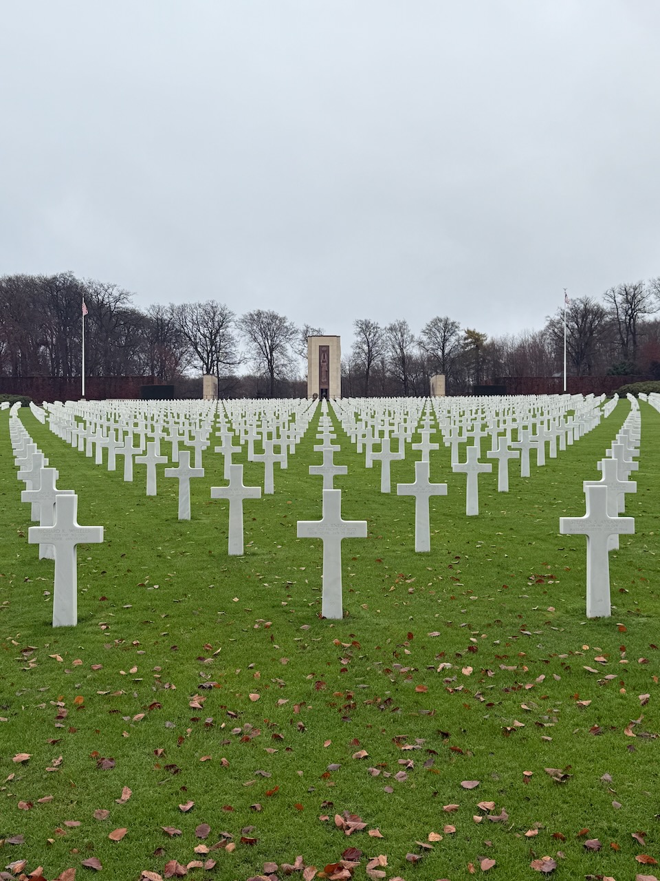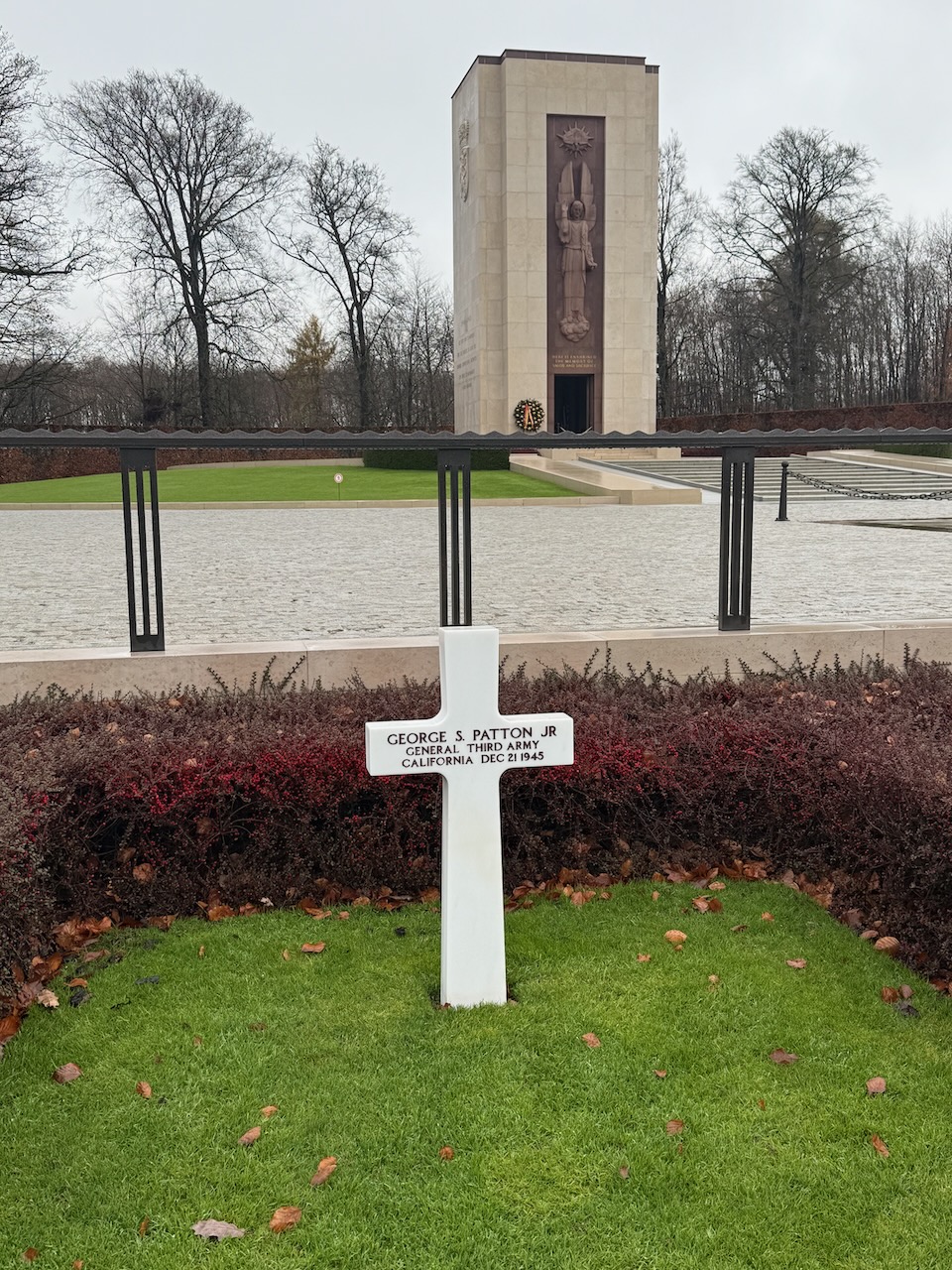 General George S. Patton’s grave is separate from the others and is up front. He used to be buried along side with his soldiers, but the other graves would get damaged by many visitors coming to find Patton’s grave, so it was moved for both the convenience and to protect the other graves.