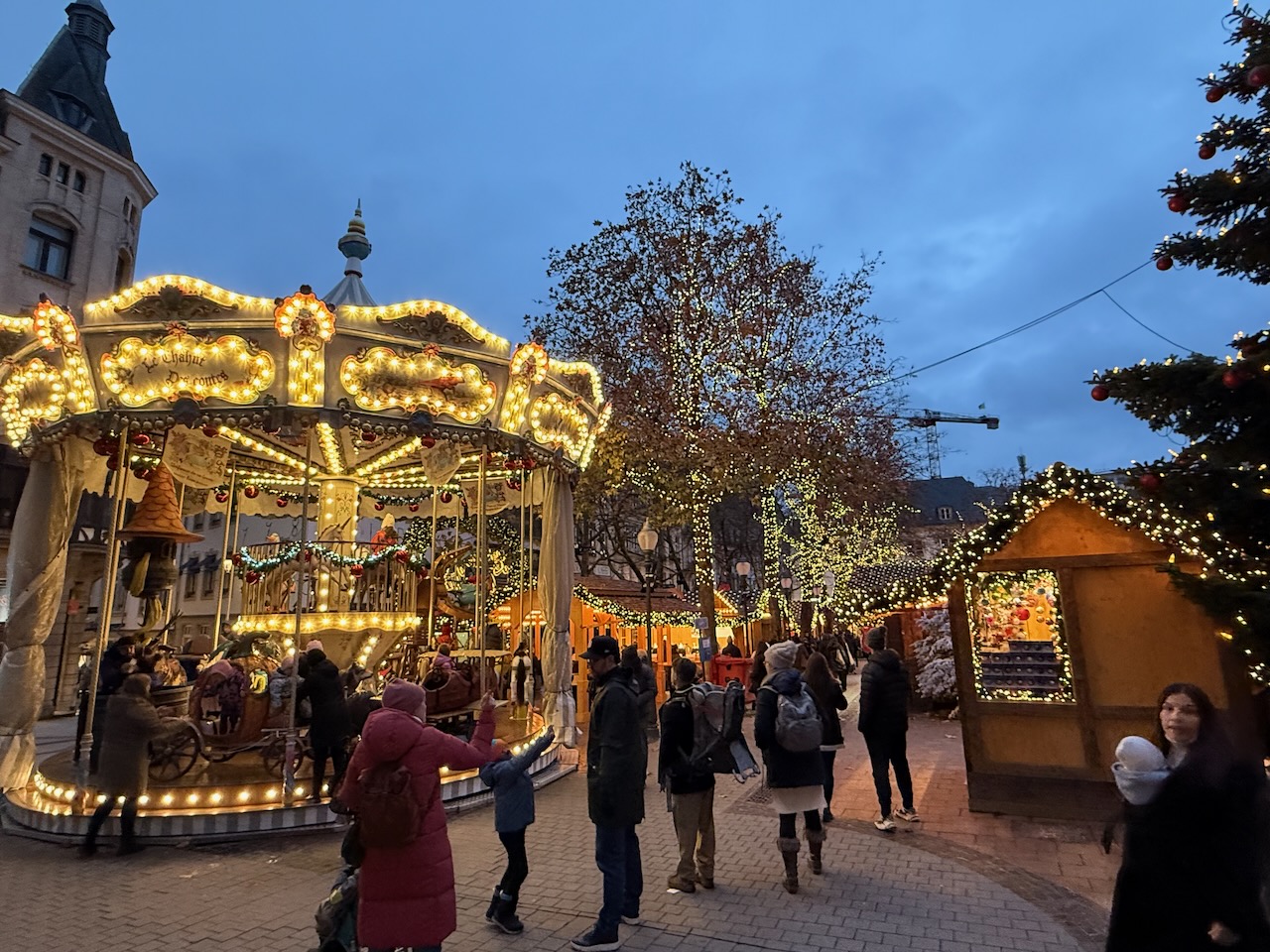 Frankfurt has amazing Christmas Market and we were lucky to be there for its opening day. We didn’t know if Luxembourg will have a market yet, because each city has different dates. Come to find out- Luxembourg had several markets going when we arrived already and they opened a week earlier! Both Place d’Armes and Place de la Constitution had beautiful markets with carousels, tons of food options and no lines.