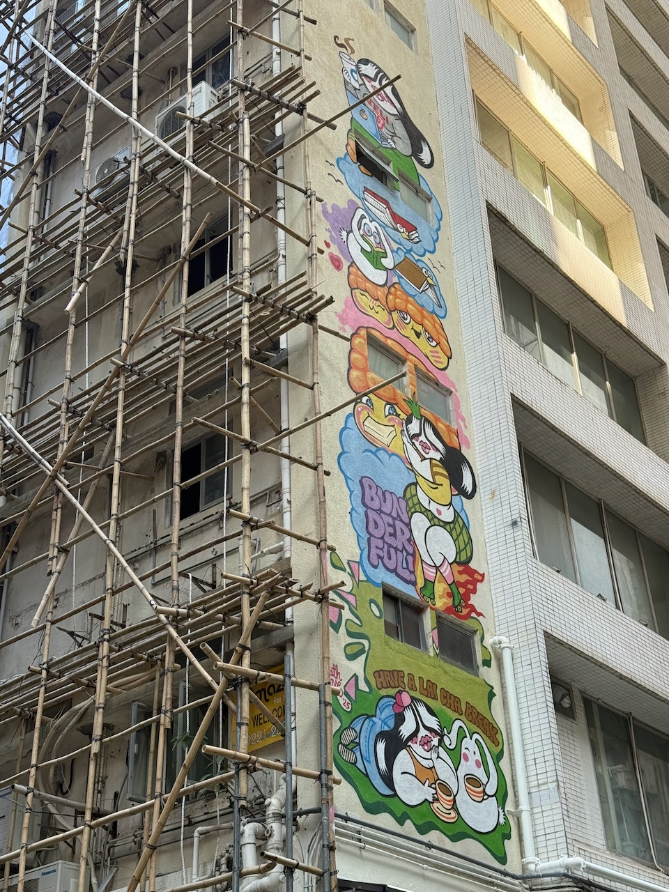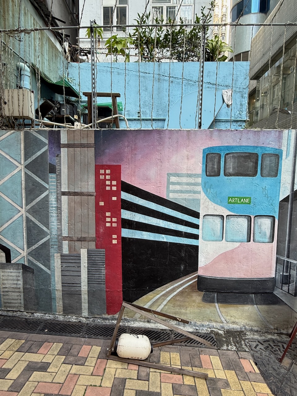Some interesting observations as we drove by: bamboo scaffolding on the buildings! Not something you see anywhere else in the world (certainly not in the USA). We loved the peaceful tram ride and got off at the last stop, close enough to the ArtLane where we were heading.