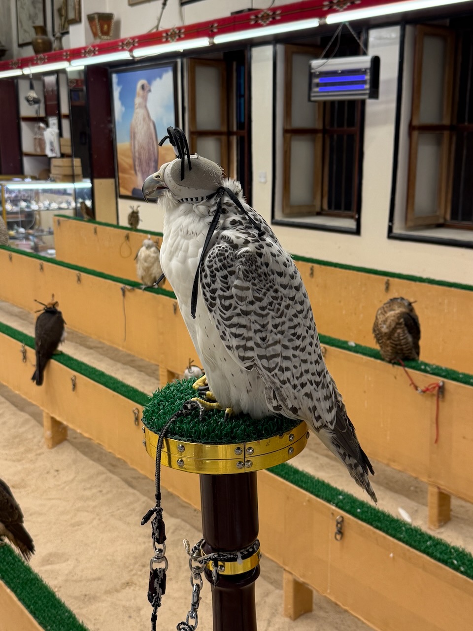 Technically, we didn’t need to return to the Souk Wakif, since we’d already had an hour-long stop here during the transit tour. But I wanted to see the Falcon Souk, so we returned. Falcon is a symbol of nobility and cultural identity. It’s the national bird of Qatar, and falconry is a very popular and protected sport. Falcons often fly in the main cabin of Qatar Airways and other airlines in the Middle East, frequently having their own seat. Since we sadly didn’t get the pleasure of flying next to a falcon, we came to see where they are being sold.