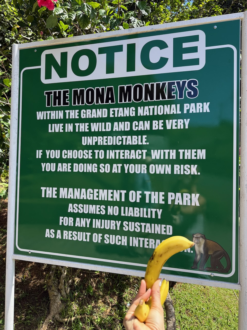 Our next stop was at Grand Etang National Rainforest. We heard that mona monkeys come close and you can feed them bananas (I absolutely took bananas from the hotel breakfast). We parked, there was a guy offering a tour to take us to the lake, but the path is very clear, so we declined the offer.