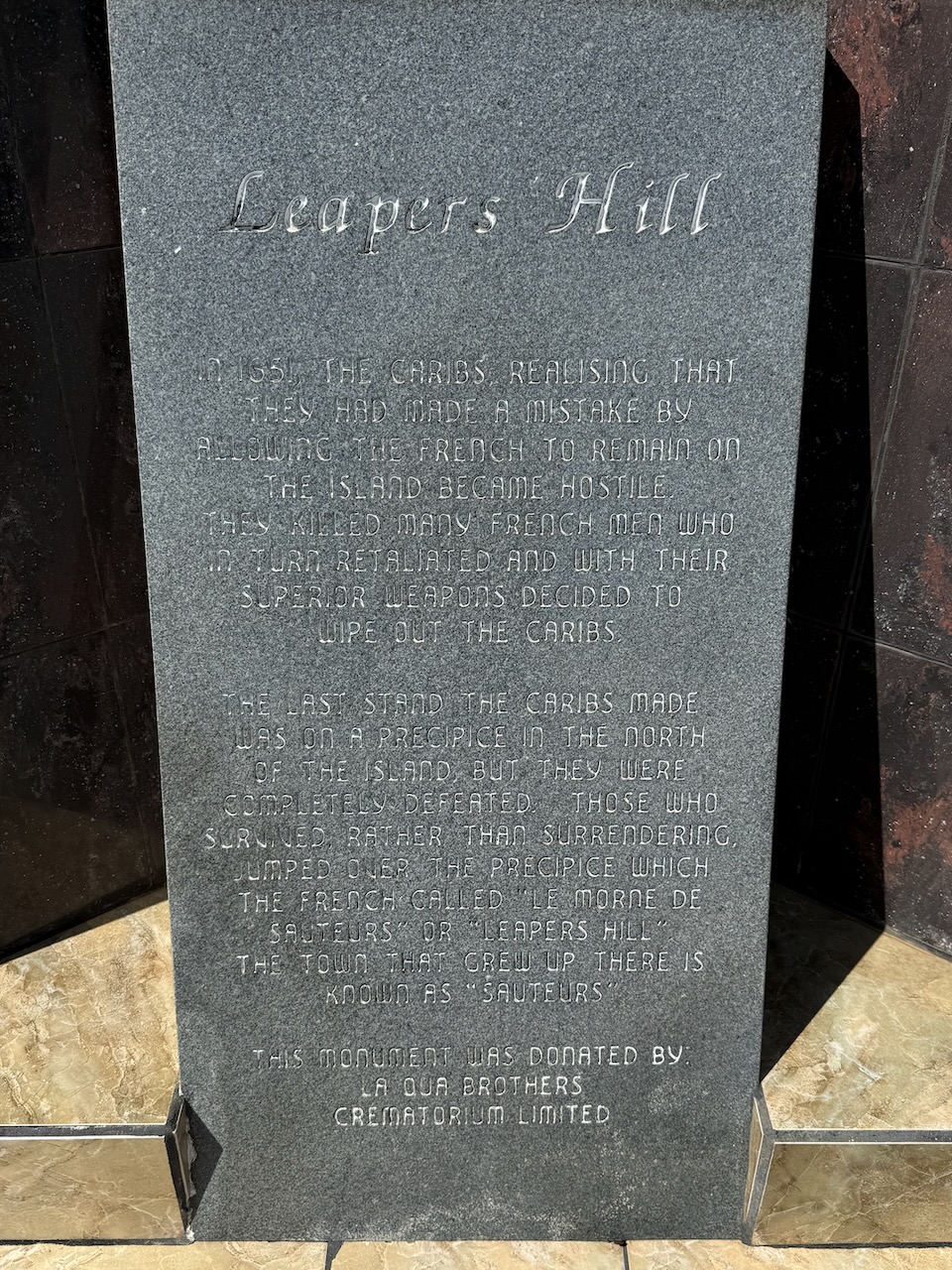 Leapers Hill is a few steps away, and it is a sad and important place in Grenada’s history. It is a cliff’s edge where around 40 Carib (Indigenous Kalinago) people jumped (leaped) to their death in 1651 so to not submit to French enslavement.